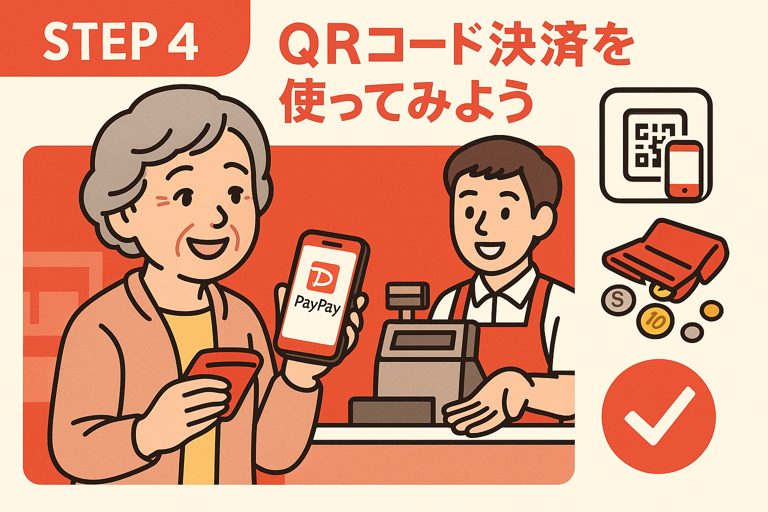 このSTEPでは、クレジット決済ができない店でどうしても「小銭」を減らしたい人向け(中級者)にスマホ1つで支払いができるQRコード決済の基本と使い方を学びます。